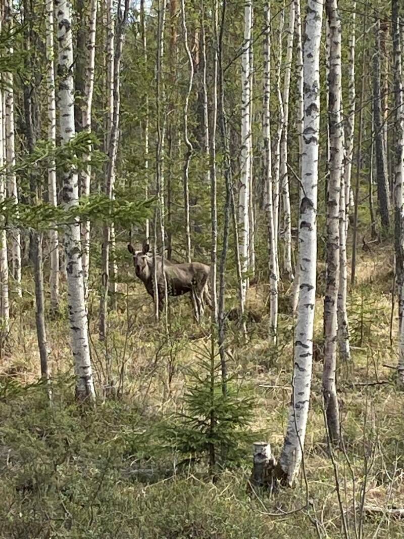 Unterwegs an der Landstraße unseren ersten Elch gesehen. Leider sind die Fotos nicht ganz deutlich, aber wir konnten dort nicht länger anhalten, und der Vierbeiner stand noch etwas zurück im Wald.