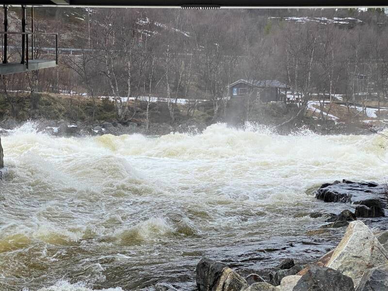 Kurz nach dem Grenzübergang befindet sich dieser imposante Wasserfall. Bedingt durch die Schneeschmelze fließt derzeit wohl sehr viel Wasser.
