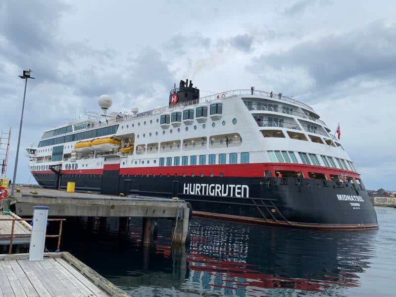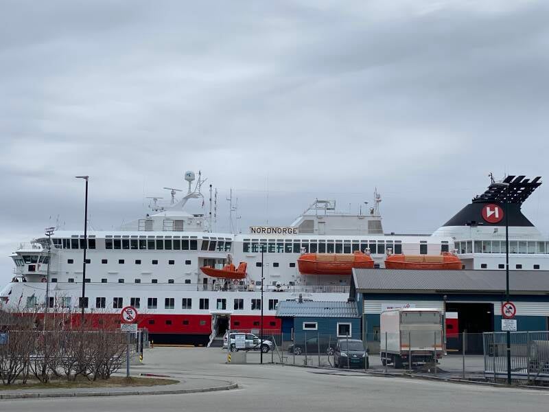 50 Meter neben unserem Wohnmobilstellplatz ist der Kai, an dem u.a. die Hurtigrutenschiffe anlegen. Am Nachmittag konnten wir wieder bei dem Anlegemanöver zuschauen. Einige Passagiere haben kurzzeitig das Schiff verlassen. Allerdings war wohl mehr als eine kleine Runde am Hafen nicht möglich, da es nach genau 55 Minuten wieder ablegte.