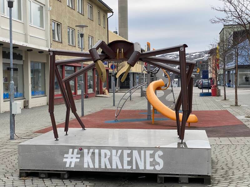 Unser Womoplatz in Kirkenes, direkt im Hafen mit Blick auf ein Schiff der Hurtigrute. Sonst vermittelt die Stadt eher den Eindruck vom „ Ende der Welt“