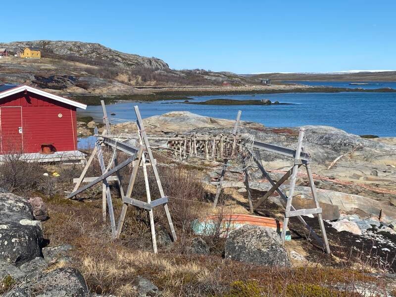 Kleine private Trockengestelle für den beliebten „torrfisk“. (Stockfisch)