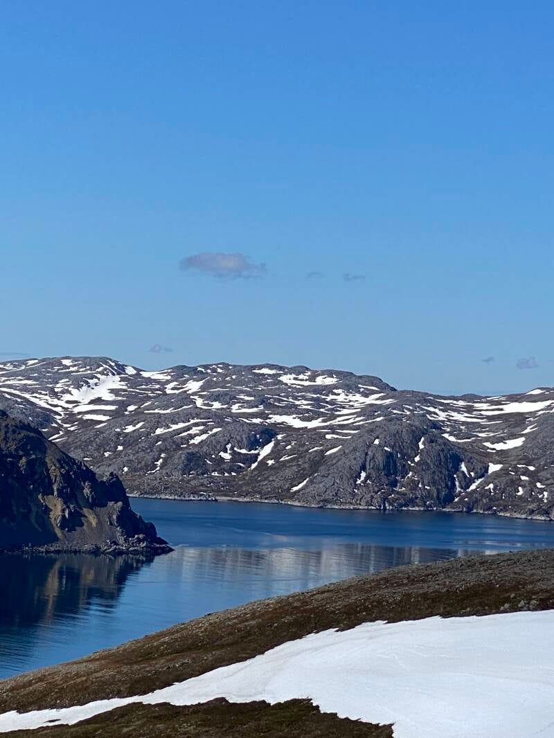 Auf der ca. 90 km langen Strecke ist eine sehr karge Landschaft zu betrachten, mit längeren sehr dünn besiedelten Abschnitten. Auch hier ist noch reichlich Schnee zu finden, damit einher sehr sehr viele Wasserläufe, kleine Wasserfälle, die alle in den Fjord münden.Der Verkehr auf der Strasse ist ebenfalls überschaubar.